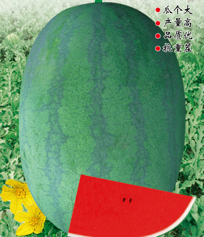 ■ 特征特性 :早中熟种,坐果至成熟28天左右,全生育期90天左右。植株长势稳健,抗病抗逆性强,生态适应性广,易坐果。果实椭圆形,果皮墨绿色底上覆暗条带,果面光滑无棱带蜡粉。瓤色深红,瓤质酥脆,中心糖14%左右,口感好,风味佳。平均单果重8-10kg左右,大者20kg以上(特殊栽培),一般亩产6000公斤以上。皮厚1.0cm左右,果皮硬度强,耐储运。高抗枯萎病抗重茬,兼抗炭疽病和病毒病,在2年重茬地种植,其产量品质无明显差异。综合性状优于目前抗病品种。